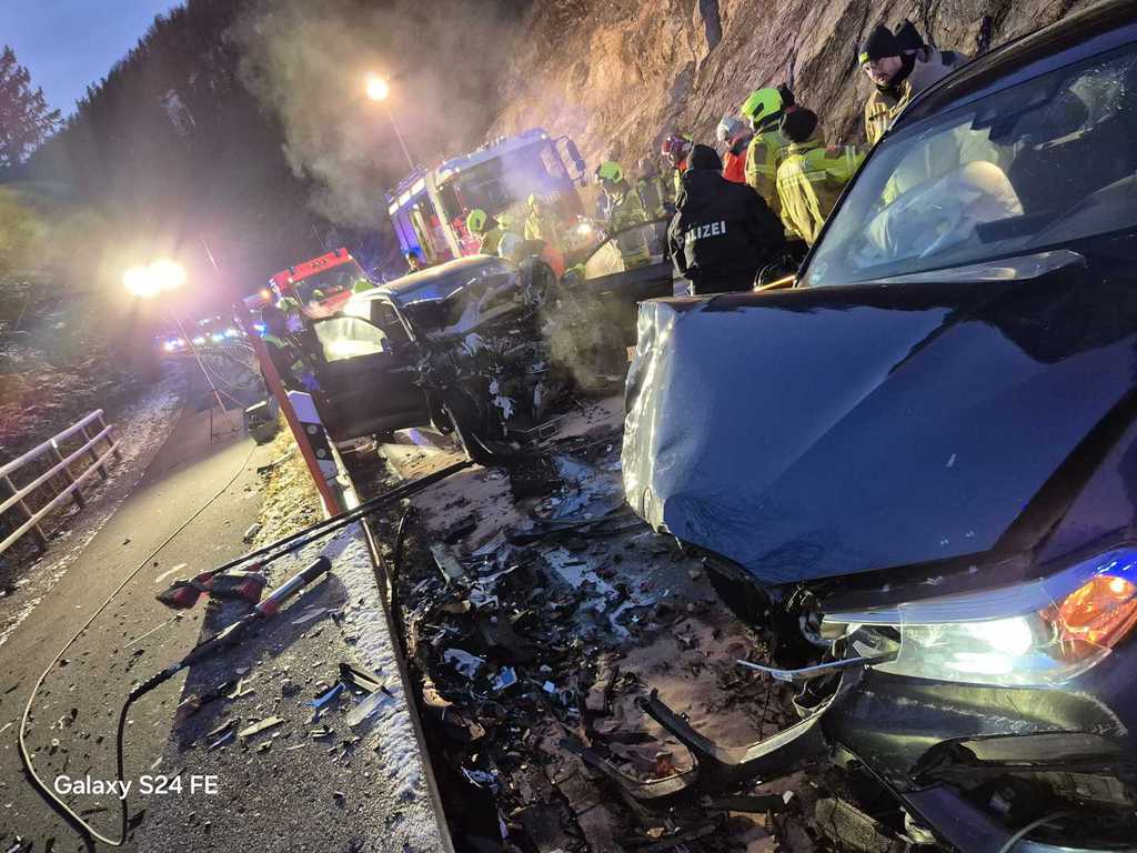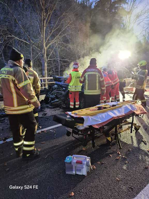 Leichtverletzten. Wir befreiten den eingeschloßenen Mercedesfahrer über das Dachfenster, sicherten die Unfallstelle und sperrten die Bundesstraße gemeinsam mit der Feuerwehr Fall.